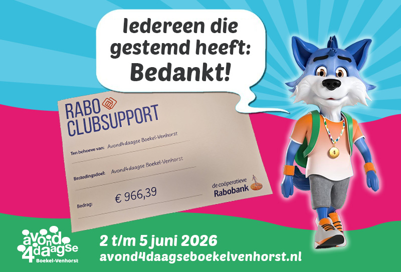 Wat een geweldig resultaat! Dankzij iedereen die op ons heeft gestemd bij Rabo ClubSupport hebben we een bedrag van €966,39 ontvangen. Namens de organisatie van de Avond4daagse Boekel-Venhorst willen we iedereen hartelijk bedanken voor het stemmen en steunen van ons initiatief.